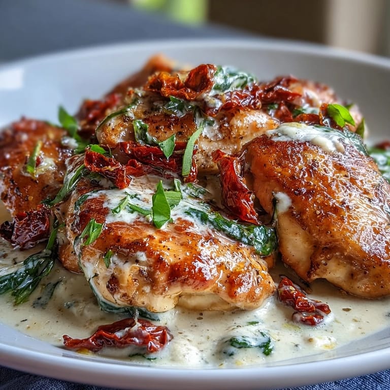 Save I stumbled onto this dish on a Tuesday evening when my fridge felt bare except for chicken, cream, and a jar of sun-dried tomatoes I'd forgotten about. The combination seemed bold at first—rich cream, tangy tomatoes, tender chicken—but the moment that first spoonful hit, I understood why Italian cooking has such a hold on people. It wasn't fancy or complicated, just honest flavors working in perfect harmony. That night turned into a weeknight staple, the kind of meal that makes you feel like you're eating something special without the stress.